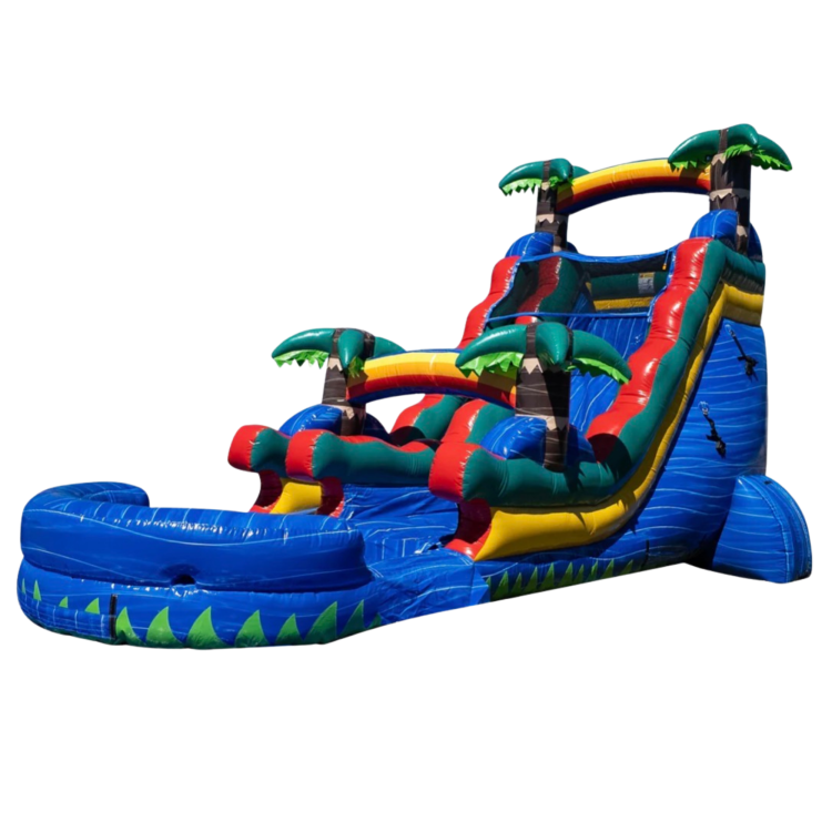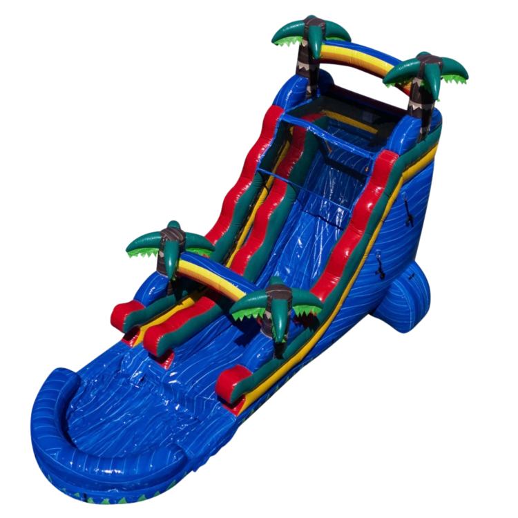 The 18FT Blue Paradise Single Lane Slide delivers a rush of tropical fun with its vibrant blue and palm tree design—making it a showstopper at any summer event. This inflatable water slide is a surefire favorite for backyard parties, school celebrations, and community gatherings.